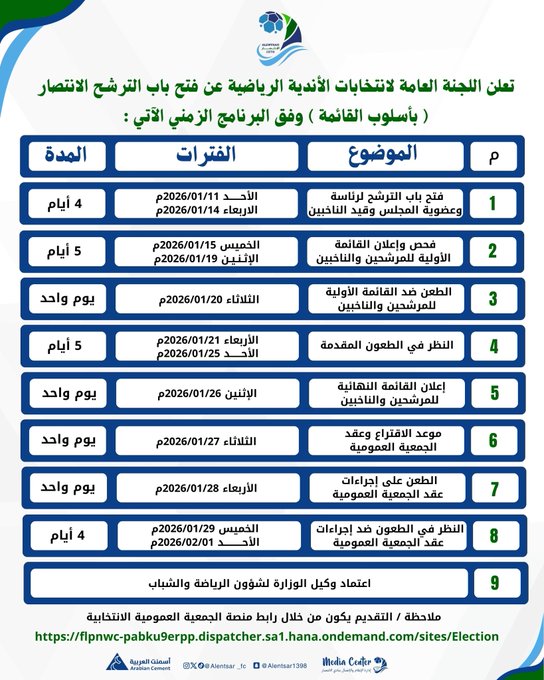 تعلن اللجنة العامة لإنتخابات الأندية الرياضية عن فتح باب الترشح لانتخاب رئيس وأعضاء مجلس إدارة نادي الانتصار التقديم يكون من قبل رئيس القائمة من خلال رابط منصة الجمعية العمومية الانتخابية erpp.dispatcher.sa1.hana.ondemand.com/sites/Election يتم إستقبال طلبات الترشح من صباح يوم الأحد 11 يناير