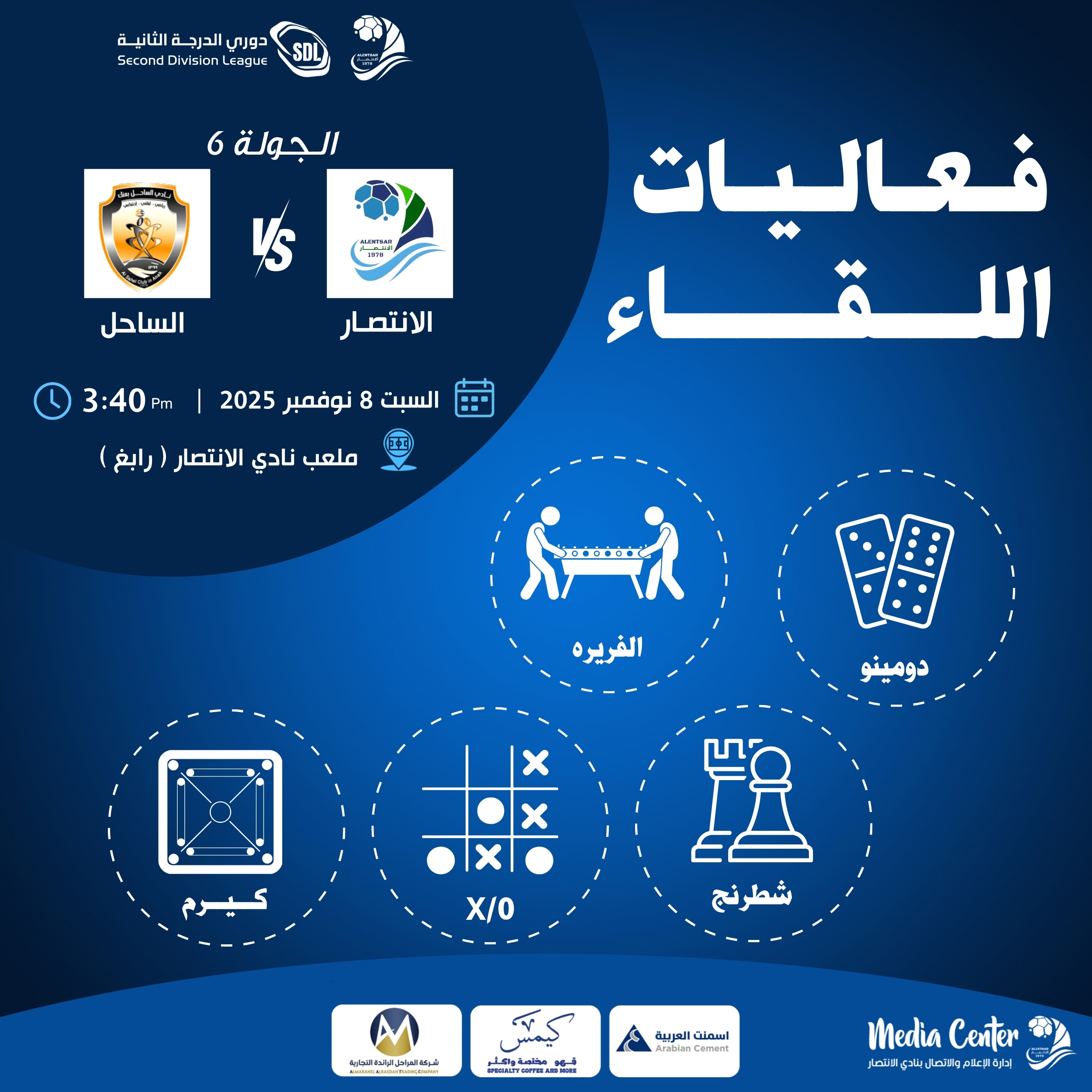 مباراة الانتصار x الساحل أحدث الأخبار أخبار النادي بعثة النادي للبلياردو تصل إلى الرياض 16 سبتمبر، 2023 | أخبار النادي 0 تذاكر مباراة الانتصار والكوكب 30 نوفمبر، 2023 | أخبار النادي 1 سنوكر السماوي .. الأول 27 أكتوبر، 2024 | أخبار النادي 3 أخبار الوزارة جولات التاسيس 15 فبراير، 2026 | أخبار الوزارة 4 البطل: قرر التحليق 14 فبراير، 2026 | أخبار الوزارة 4 صقورنا إلى نصف نهائي بطولة كأس العرب 11 ديسمبر، 2025 | أخبار الوزارة 4 أخبار المحافظة لون الحياة 8 مارس، 2026 | أخبار المحافظة، أخبار النادي مبادرة اجمل تلاوة 1 مارس، 2026 | أخبار المحافظة، أخبار النادي يوم التاسيس 22 فبراير، 2026 | أخبار المحافظة