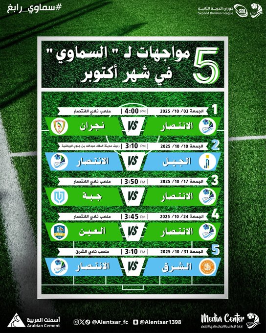 في شهر أكتوبر مباريات يخوضها #السماوي كل الدعوات لنادينا بالتوفيق أحدث الأخبار أخبار النادي إدارة المسؤولية الإجتماعية بالنادي تواصل اليوم الثاني في تنفيذ برنامج “كن المنقذ” 11 سبتمبر، 2023 | أخبار النادي 0 تذكرة مباراة الانتصار x اللواء 26 ديسمبر، 2023 | أخبار النادي 1 طـلّـت الانتصار فـي نـوفـمـبـر 1 نوفمبر، 2024 | أخبار النادي 4 أخبار الوزارة #الأخضر_إلى_كأس_العالم_2026 15 أكتوبر، 2025 | أخبار الوزارة 4 صقورنا أبطال الذهب 3 أكتوبر، 2025 | أخبار الوزارة 4 رئيس نادي #الانتصار يهنئ القيادة الرشيدة والشعب السعودي بذكرى اليوم الوطني 95 23 سبتمبر، 2025 | أخبار الوزارة 5 أخبار المحافظة أكادمية نادي الانتصار 20 أكتوبر، 2025 | أخبار المحافظة، أخبار النادي مذكرة تفاهم مع #جامعة_الملك_عبدالعزيز 16 أكتوبر، 2025 | أخبار المحافظة، أخبار النادي مبادرة أعرف ارقامك 14 أكتوبر، 2025 | أخبار المحافظة، أخبار النادي